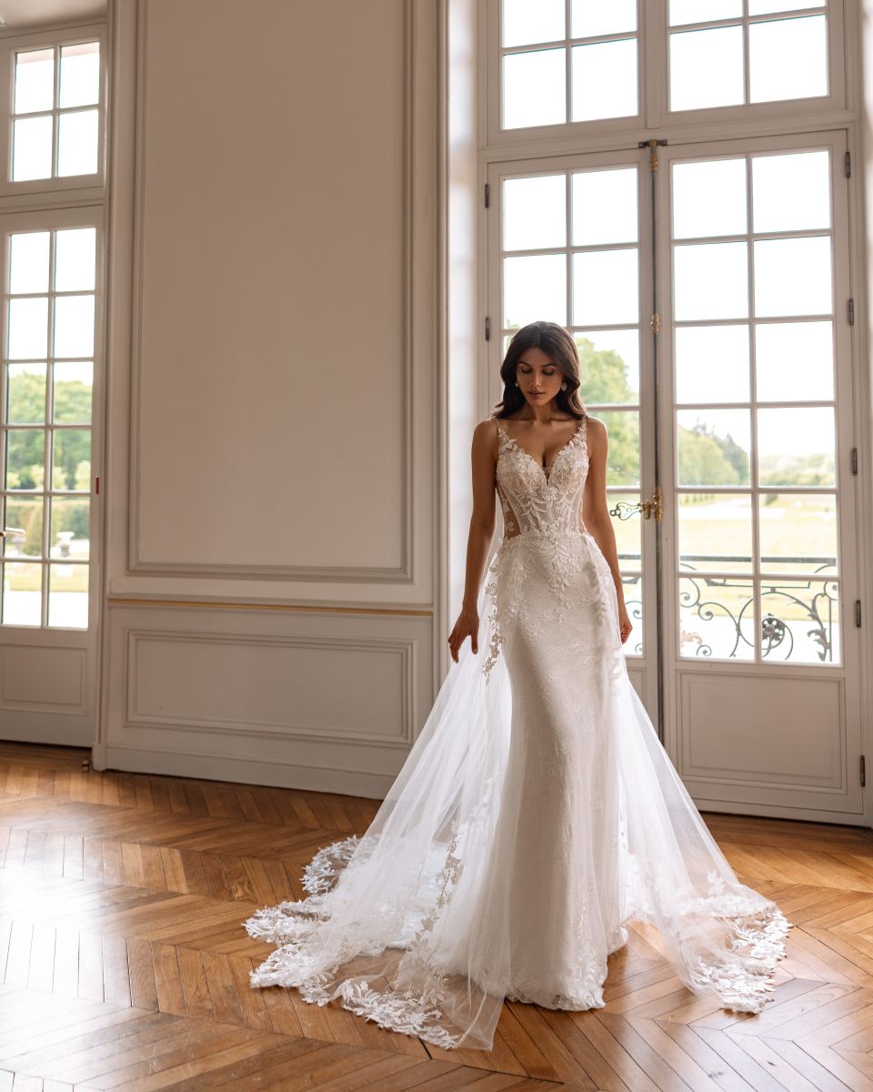 Vorhanden in Gr. 42 mit abnehmbaren Ärmelchen und einer versteckten Schnürung. Farbe ivory.